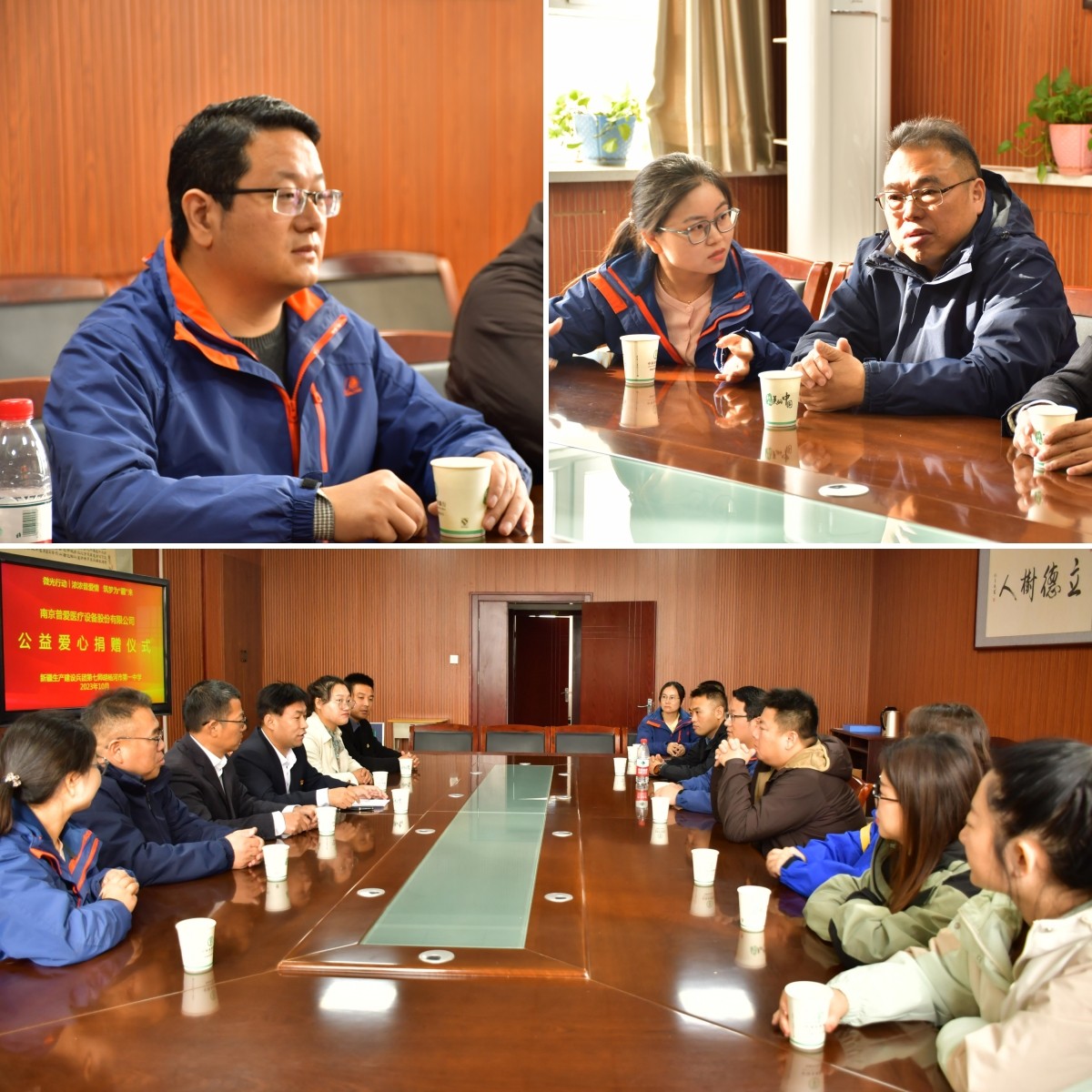 公益小組和校領導、外省援疆的老師們進行了深入的交流,詳細了解學校和當?shù)貙W生的情況。胡楊河市第一中學位于新疆建設兵團第七師胡楊河市,是江蘇省對口援疆學校,在校生1300余名,有10名省外支教的老師。近年來,因為公益組織和愛心企業(yè)的捐贈,學校的辦學條件越來越好,學生也能在更舒適的環(huán)境中努力學習。