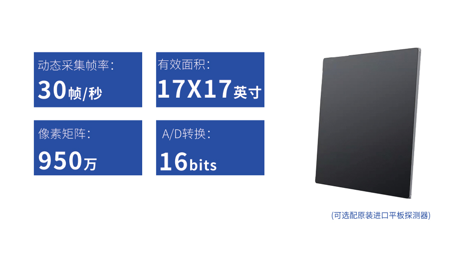 ● 17*17英寸的超高清像素動態(tài)平板探測器,更大的視野范圍,無需移動即可觀察整個動態(tài)過程,避免拖尾、噪聲對圖像的影響;